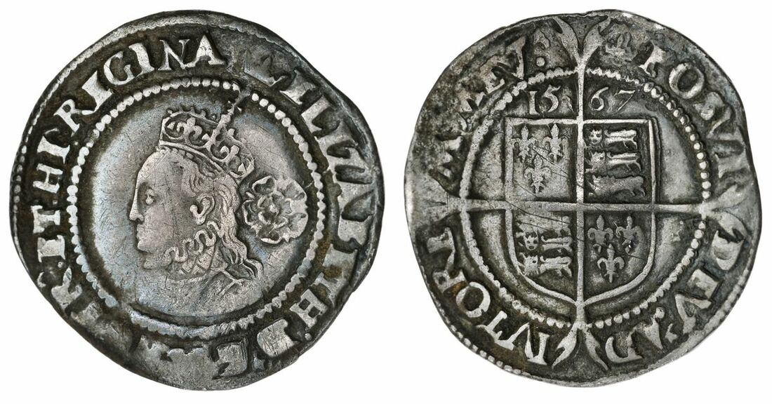 Elizabeth I (1558-1603), Third and Fourth Issues, Sixpence, 1567, Tower, intermediate crowned bust 4B left, rose behind, rev. square-topped shield over long cross fourchée, 2.77g, 8h, m.m. coronet (North 1997; Spink 2562), lightly scratched, otherwise with a pleasing and uniform dark tone, very fine