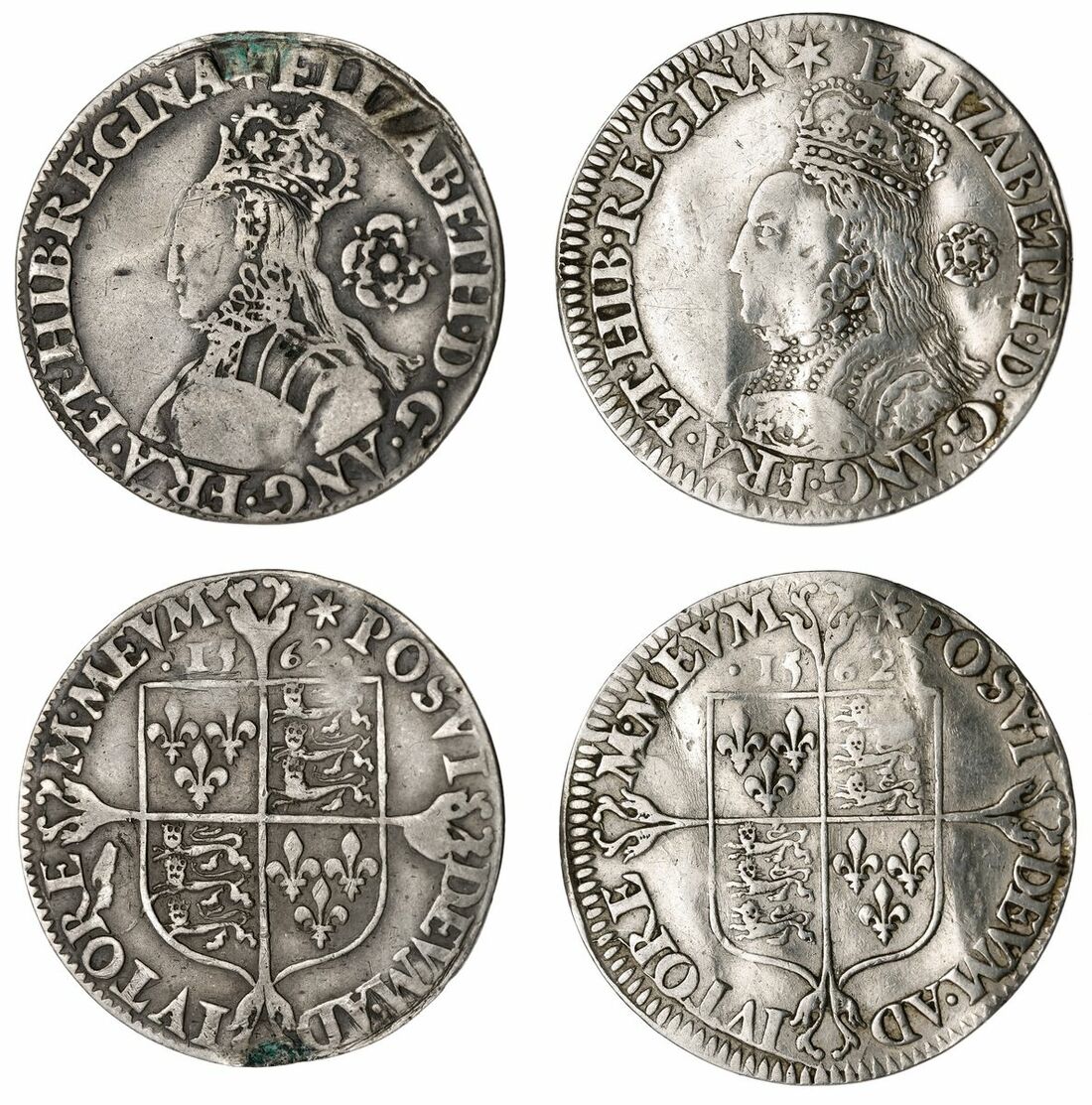 Elizabeth I (1558-1603), Mestrelle's Milled Issue, Sixpence, 1562, Tower, broad crowned bust left, small rose behind, rev. shield over long cross fourchée, 3.07g, 7h, m.m star (North 2027; Spink 2596), cleaned, lightly creased and flattened, nevertheless still with much detail to the bust, bolder fine; another, Sixpence, 1652, Tower, tall crowned bust left, large rose behind, rev. shield over long cross fourchée, 2.98g, 6h, m.m. star (North 2025/2; Spink 2594), green deposit at 12 o'clock, rubbed, bold fine (2)
