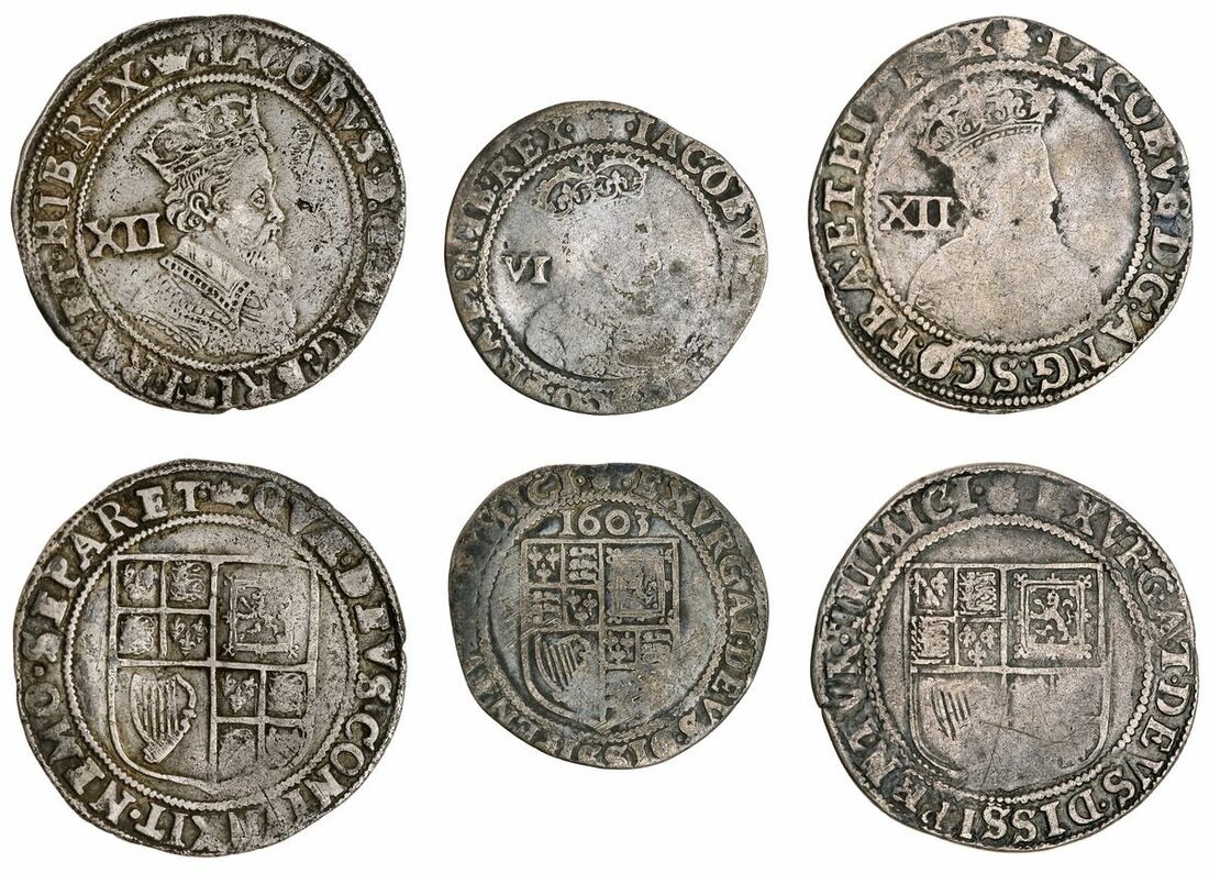 James I (1603-1625), First Coinage, Shilling, 1603-1604, first bust right, rev. square-topped shield, 11h, 5.61g, m.m thistle (North 2072; Spink 2645), fair; Sixpence, first bust right, rev. square-topped shield, m.m thistle 11h, 2.57g (North 2074; Spink 2647), fair; Third Coinage, Shilling, sixth bust right, rev. square-topped shield, 3h, 5.64g, m.m coronet (North 2124; Spink 2668), lightly pitted surfaces, otherwise very fine (3)