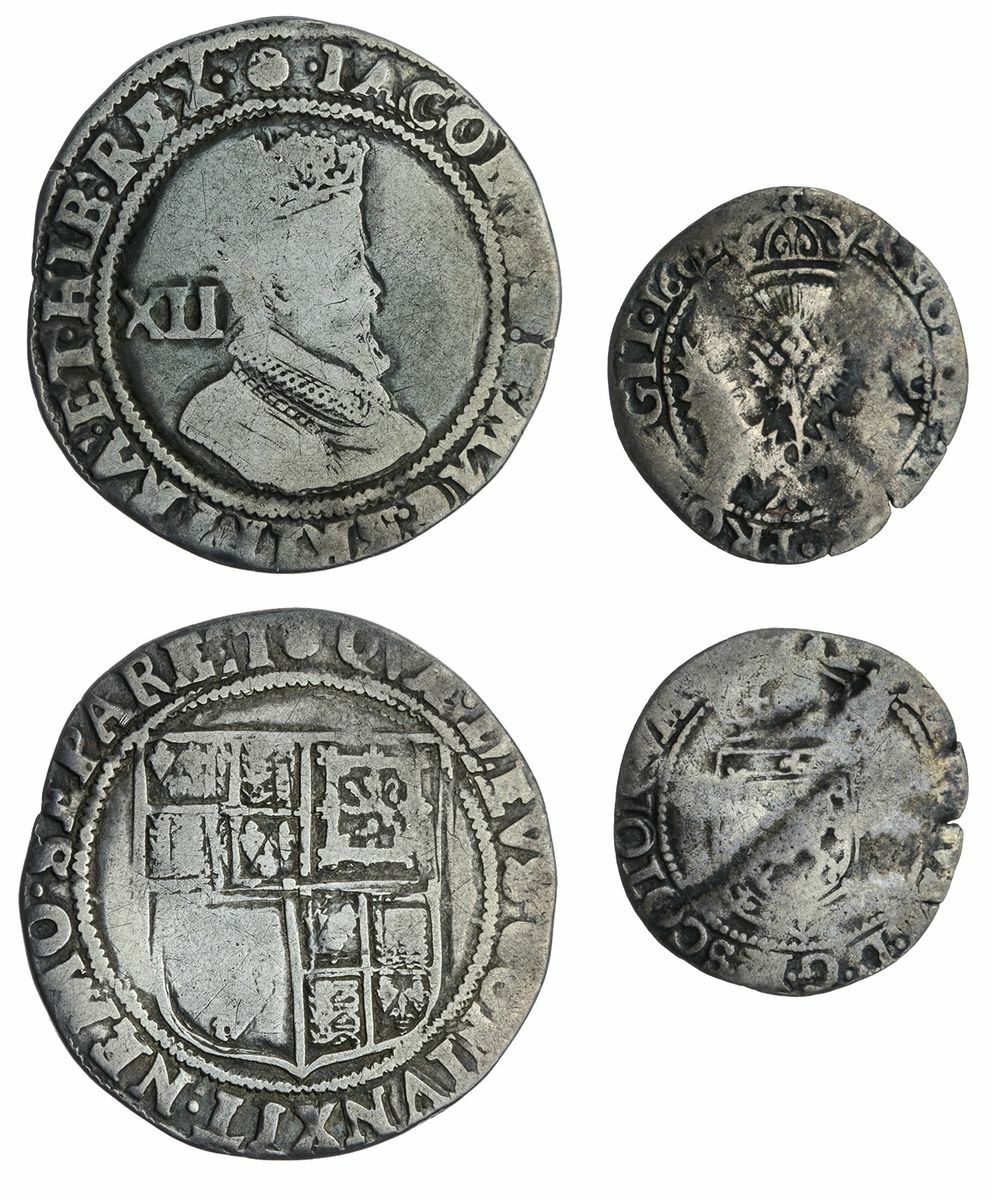 James I (1603-1625), Second Coinage, Shilling, 1605-1606, Tower, third crowned and draped bust right, rev. square-topped shield, 5.38g, 5h, m.m. rose (North 2099; Spink 2654), mostly flat to otherwise darkly toned surfaces, fair; also, Scotland, James VI (1657-1625), Eighth Coinage, Quarter-Thistle-Merk, 1602, crowned arms, rev. crowned thistle, 1.24g, 4h (Spink 5499), creased and flat in parts, fair (2)