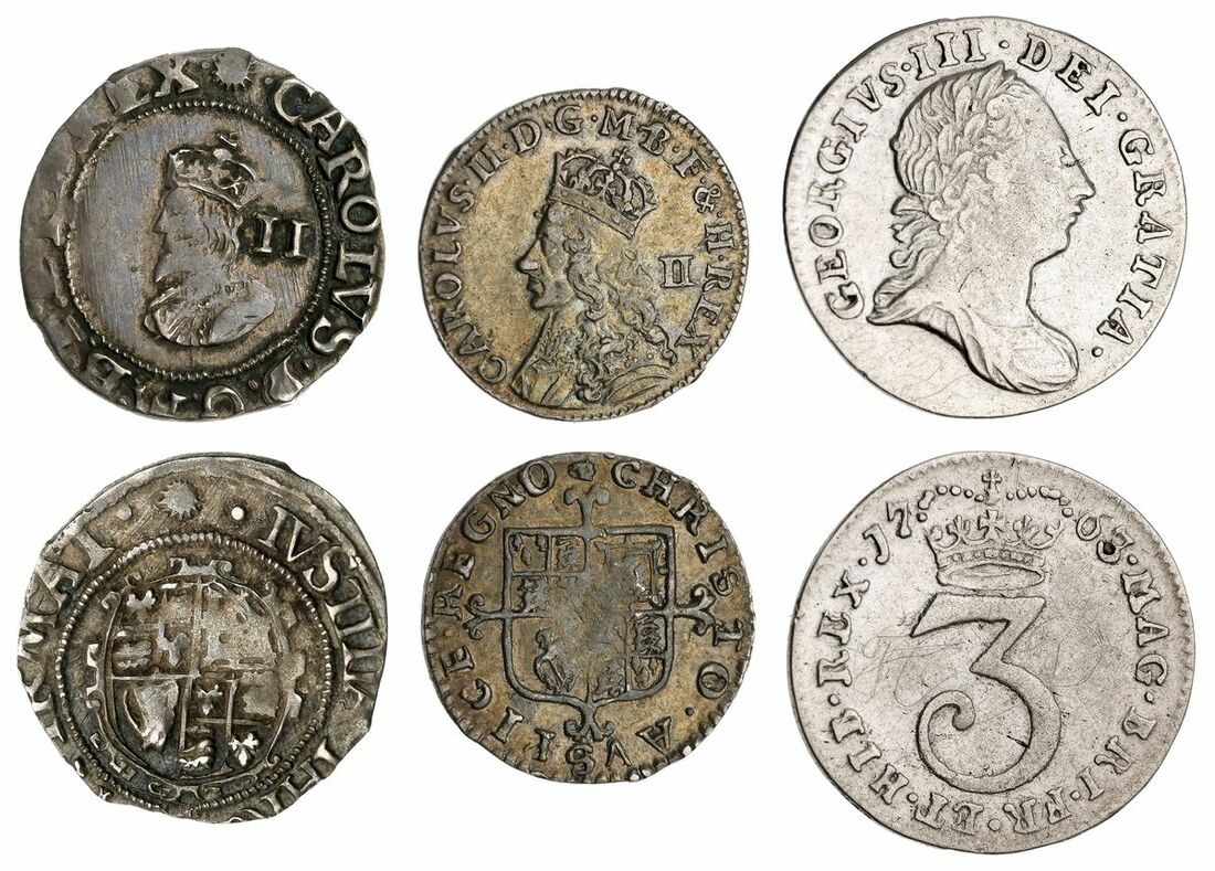 Charles I (1625-1649), Group G, Halfgroat, Type 3a7, Tower (under Parliament), seventh crowned bust, rev. oval garnished shield, 0.93g, 3h, m.m. sun (North 2257; Spink 2836), mostly flat, yet with a rich pleasing cabinet tone, bold fine; Charles II (1660-1685), Maundy Twopence, Type F, undated, crowned bust left, value behind, rev. square-topped shield over fourchée, 1.00g, 6h (ESC 2169; Bull 588; Spink 3387), softness to the shield, lightly polished yet with a rich tone, very fine; also, George III (1760-1820), Threepence, 1763, young laureate head right, rev. crowned value, plain edge, 1.42g, 6h (ESC 2034; Bull 2255; Spink 3753), bright and graffitied to the reverse, otherwise very fine (3)