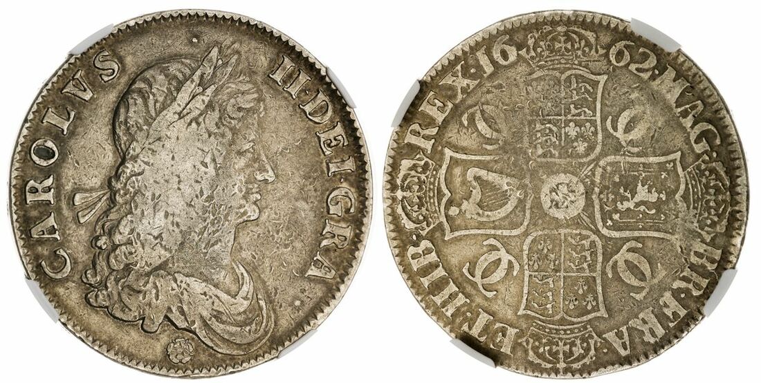 (x) Charles II (1660-1685), 'Rose' Crown, 1662 [undated edge], Type A1, first laureate and draped bust right, stop above, ties between AR, rose below, rev. crowned shields cruciform, interlinked C's in angels, seven strings to harp, stop after HIB, downwards lettered edge, 7h (Broad [1981] AA.1; ESC 15A; Bull 340; Spink 3350), heavily pockmarked surfaces and some faint bruises to the edge, yet with a faint tone, bolder fine, in NGC holder, graded Fine Details ~ Damaged (Cert. #6482540-014)