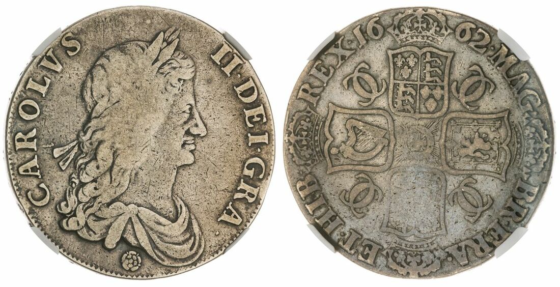 (x) NGC VF20 | Charles II (1660-1685), 'Rose' Crown, 1662 [1662], first laureate and draped bust right, stop above, rose below, rev. stop after HIB, crowned shields cruciform, interlinked C's in angles, six strings to harp, downwards lettered edge, 6h (ESC 17; Bull 344; Spink 3351), lightly polished now retoning, fine, in NGC holder, graded VF20 (Cert. #5974863-002)