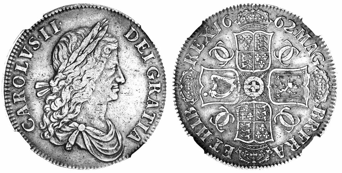(x) NGC XF40 | Charles II (1660-1685), Crown, 1662 [undated], first laureate and draped bust variety right, no rose, rev. crowned shields cruciform, interlinked Cs in angles, ten strings to harp, upwards lettered edge, no date, 6h (ESC 18; Bull 347; Spink 3353), lightly bagmarked and some scratches to the reverse, nevertheless with a pleasing uniform tone, the legends pleasingly struck-up, good very fine, in NGC holder, graded XF40 (Cert. #6482552-025)