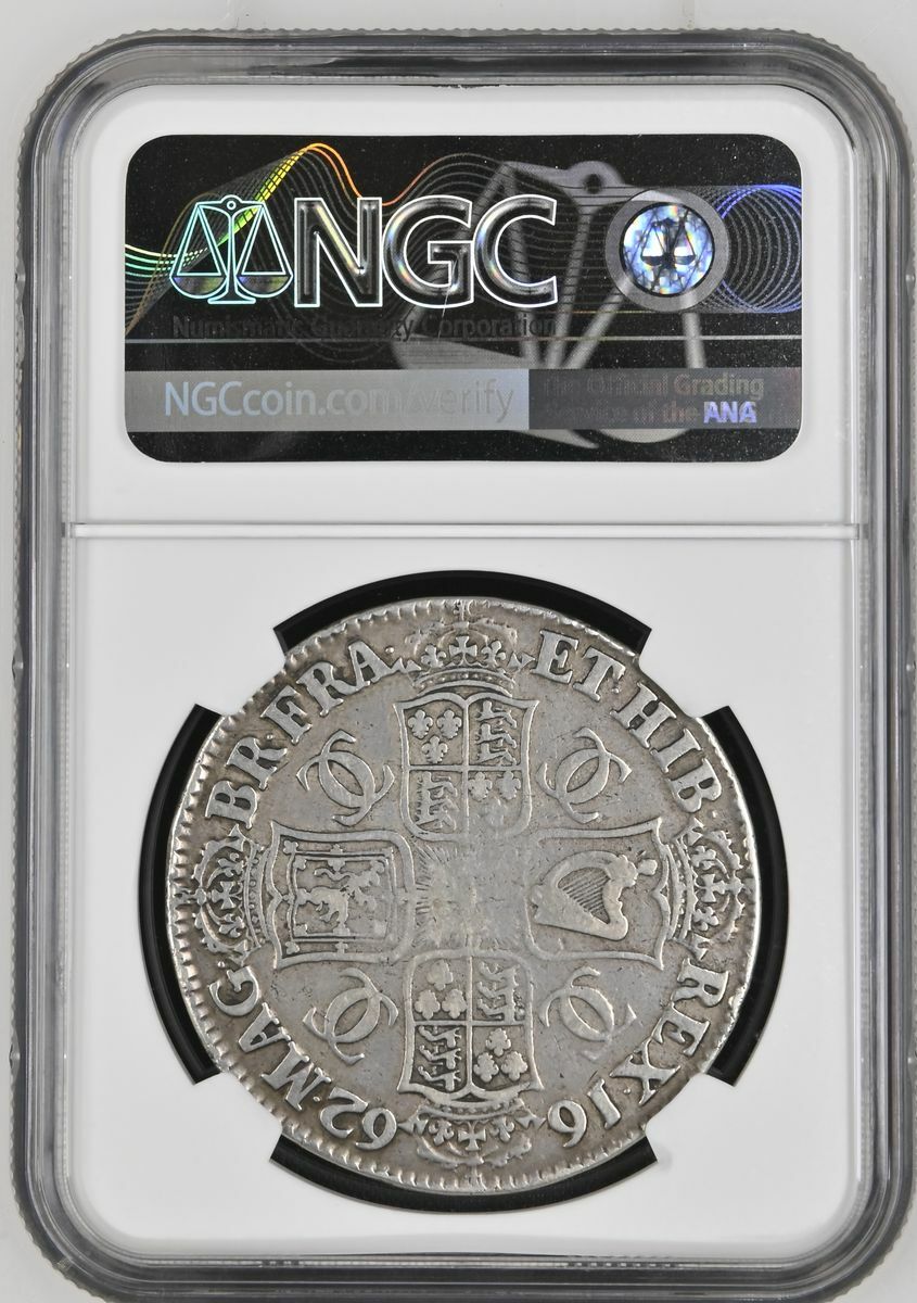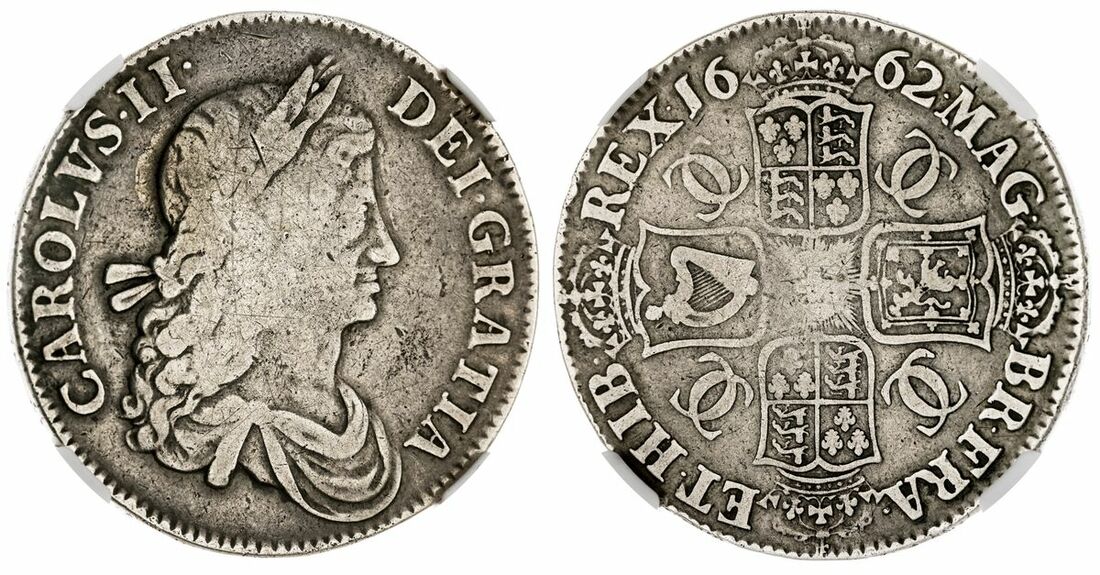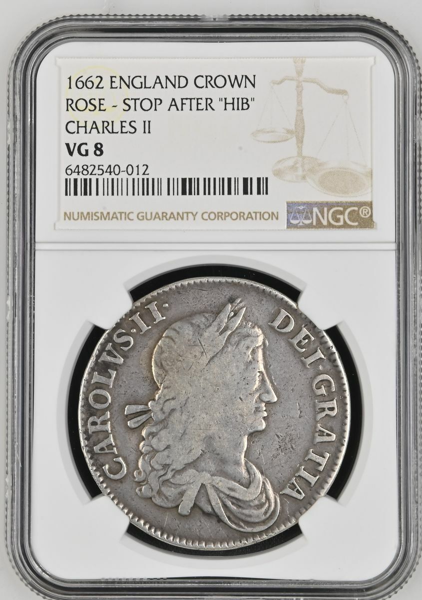 (x) NGC VG8 | Charles II (1660-1685), Crown, 1662 [undated], first laureate and draped bust variety right, short stubby ties, no rose below, rev. crowned shields cruciform, stop after HIB, ten strings to harp, undated edge upwards, 29.41g, 6h (ESC 18; Bull 347; Spink 3353), rubbed, stained and lightly toned, fair / good, in NGC holder, graded VG8 (Cert. #6482540-012)