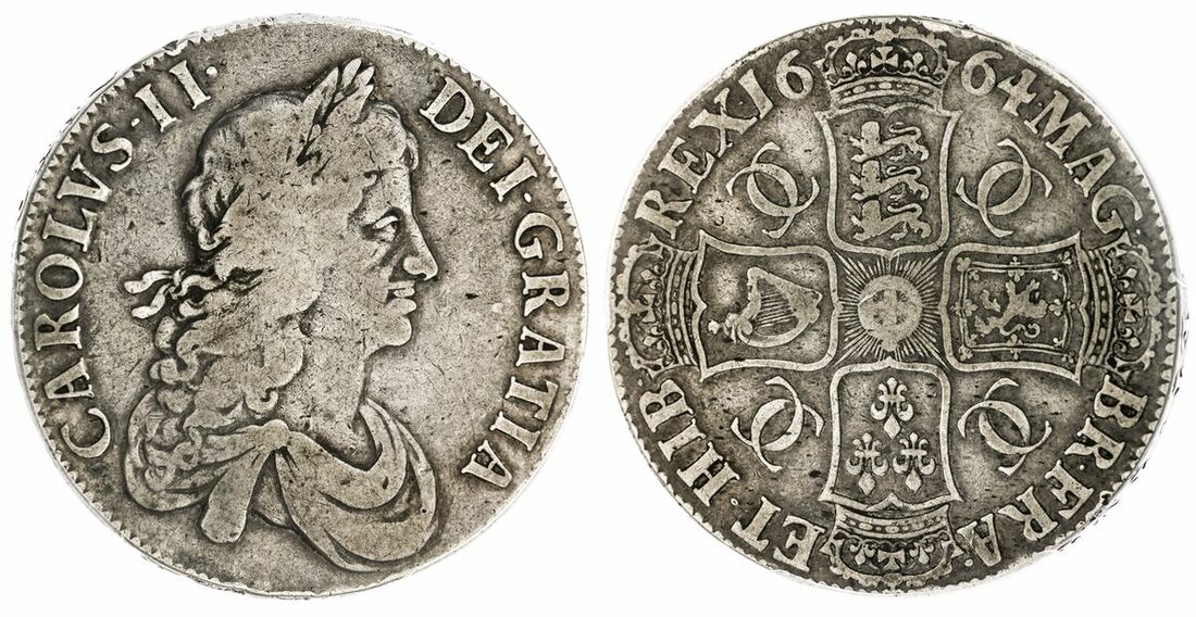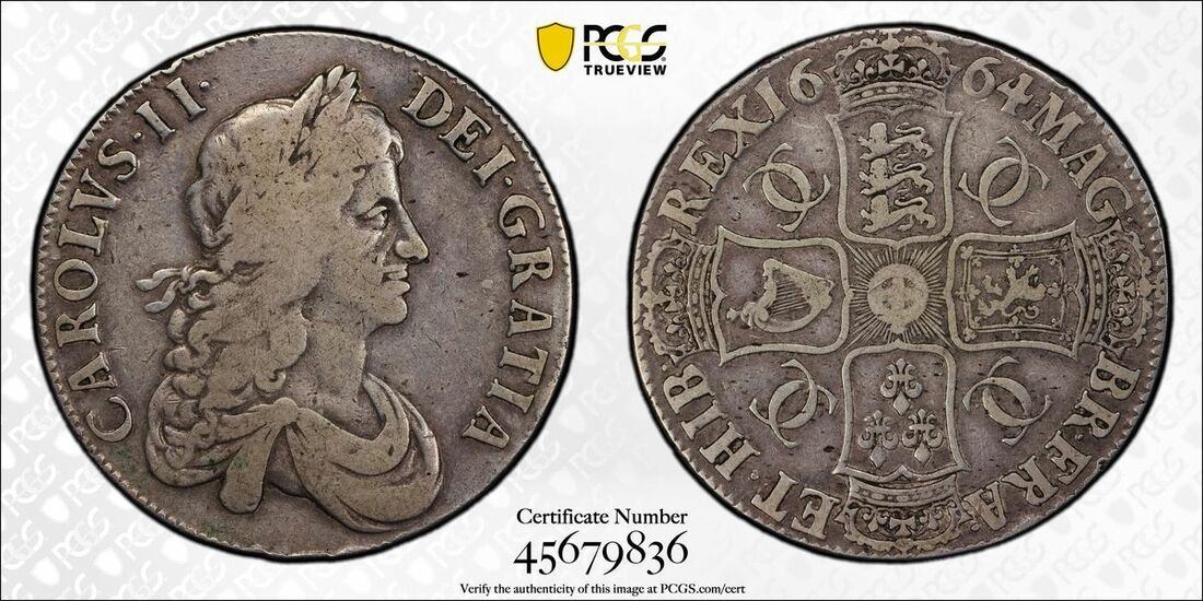 (x) PCGS VF30 | Charles II (1660-1685), Crown, 1664 XVI, on a small flan, second bust right, 'crooked' ties curving outwards, rev. crowned shields cruciform, nine strings to harp, lettered edge upwards, 6h (Bull 363a but incorrect regnal year given and seven strings not noted; ESC 28; Spink 3355), contact marked and flat to the highest points of the central devices, yet with a hint of tone in the fields, about very fine, in PCGS holder, graded VF20 (Cert. #45679836)