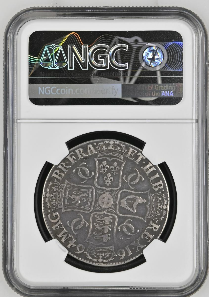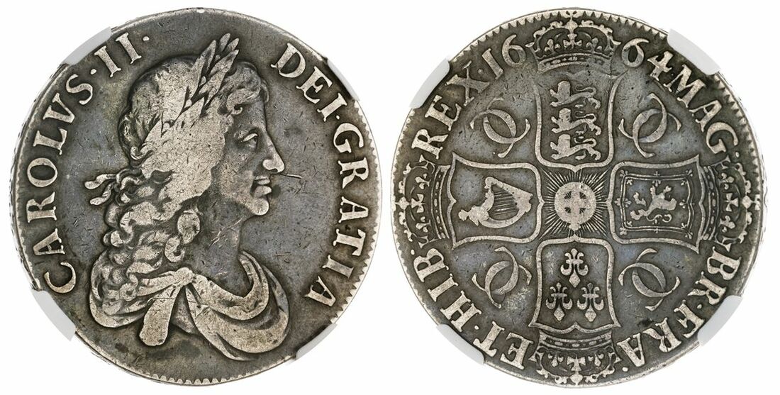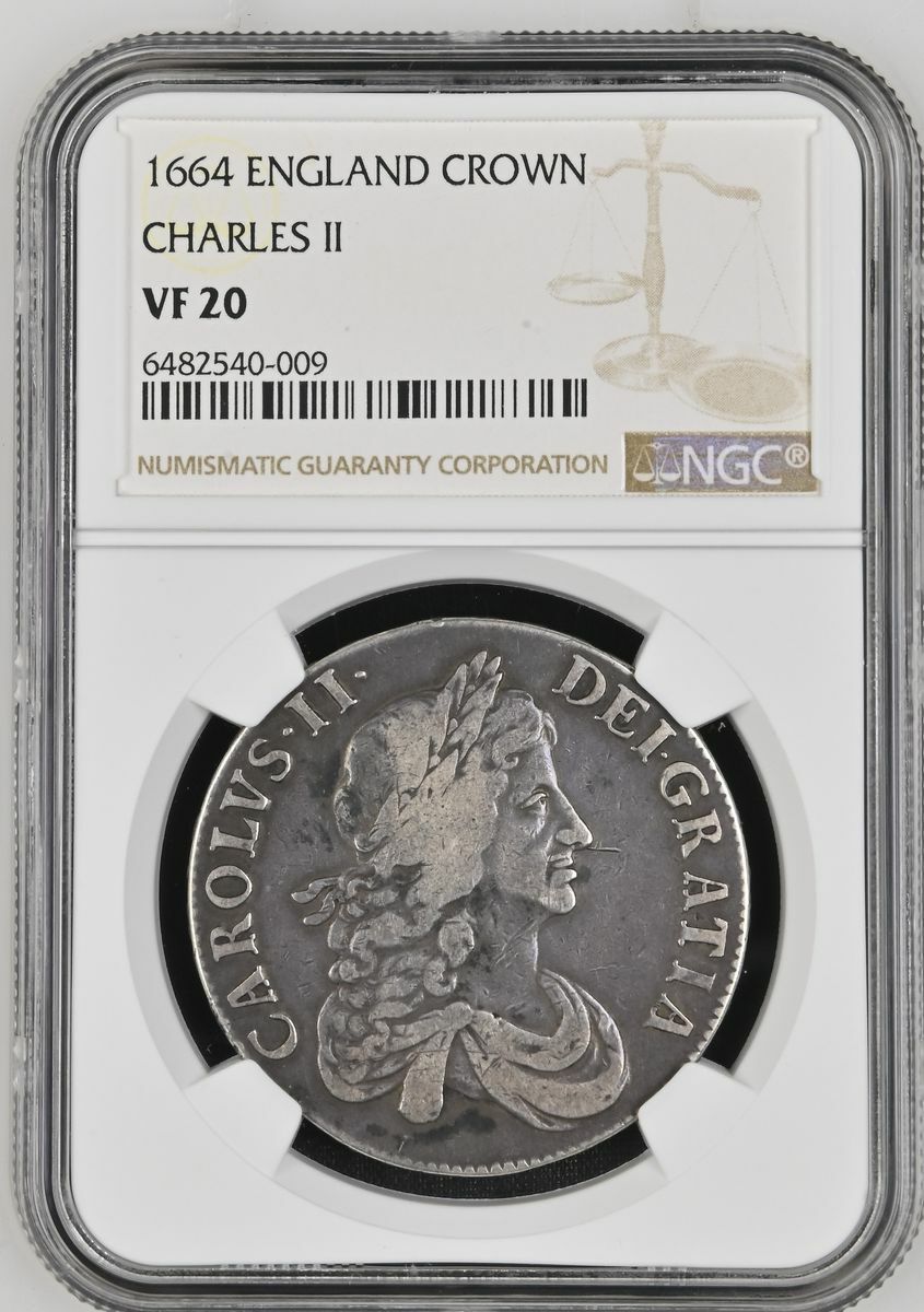 (x) NGC VF20 | Charles II (1660-1685), Crown, 1664 XVI, on a small flan, second bust right, 'crooked' ties curving outwards, rev. crowned shields cruciform, seven strings to harp, lettered edge upwards, 29.57g, 6h (Bull 363a but incorrect regnal year given and seven strings not noted; ESC 28; Spink 3355), scratch before nose and flaw by FRA, rubbed and with striking softness below date, otherwise darker tone, a pleasantly bold fine, in NGC holder, graded VF20 (Cert. #6482540-009)