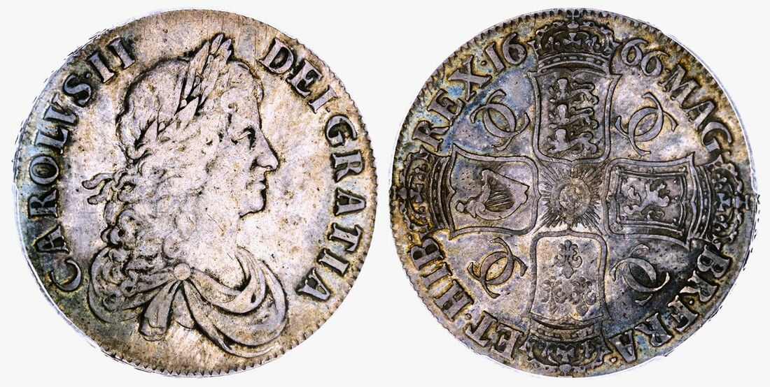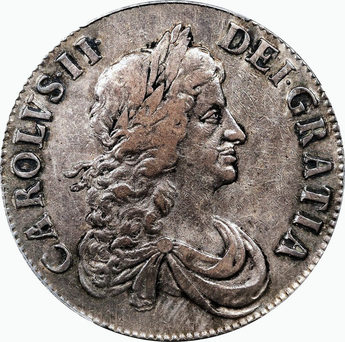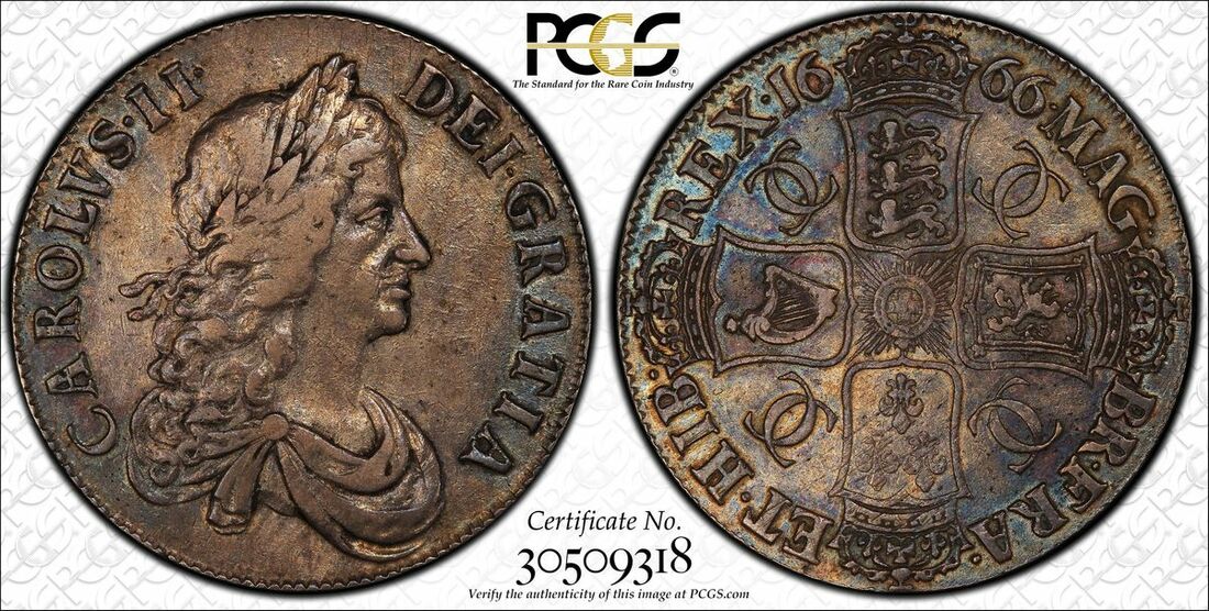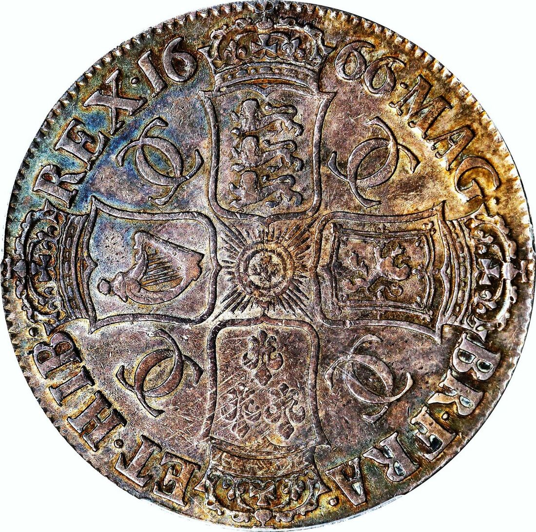(x) PCGS VF35 | Charles II (1660-1685), Crown, 1666 XVIII, second laureate and draped bust variety right, crooked ties curve outwards, rev. crowned shields cruciform, interlinked C's in angles, six strings to harp, upwards lettered edge, 6h (ESC 32; Bull 366; Spink 3355), some adjustments marks through the French shield and softness to the higher points, otherwise with a rich cabinet tone, a pleasing very fine, the date of issue very scarce, the year infamous in the history of London and the story of Spink, in PCGS holder, graded VF35 (Cert. #30509318)