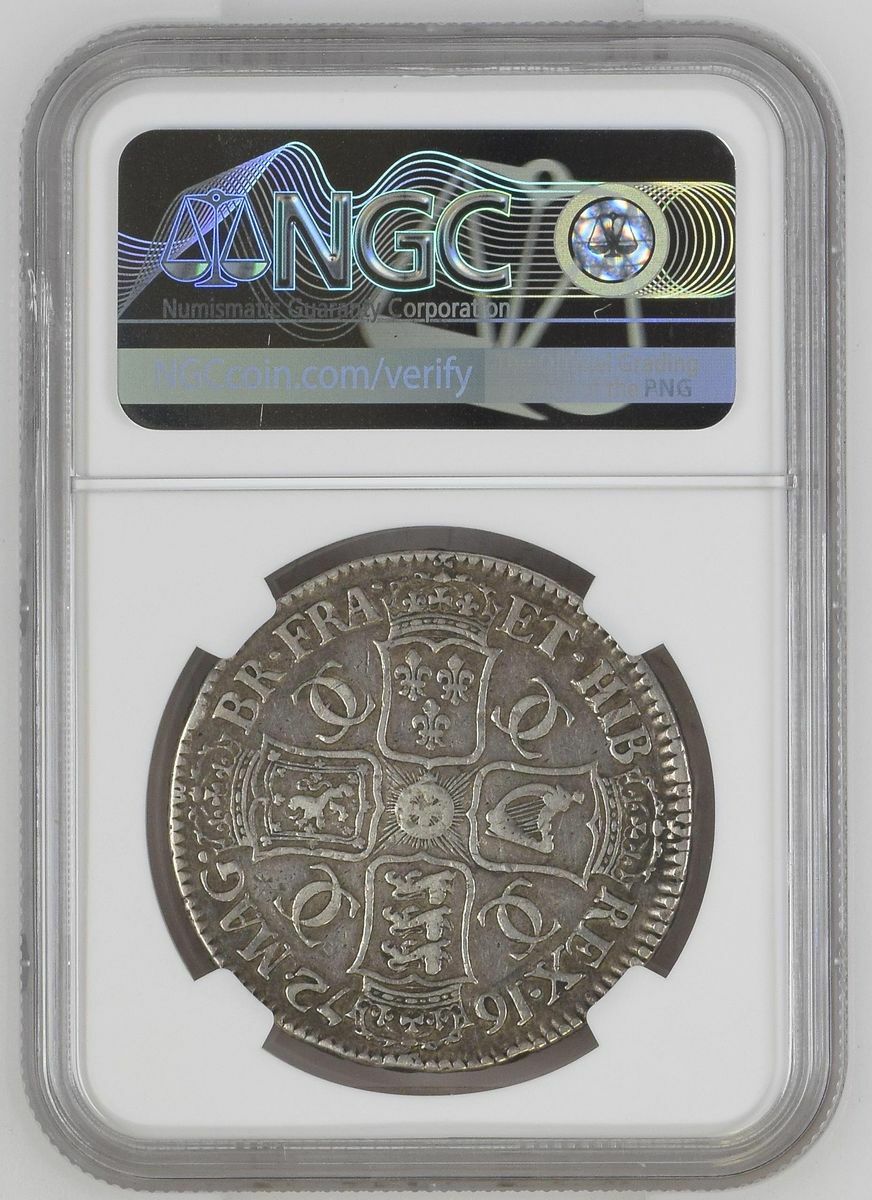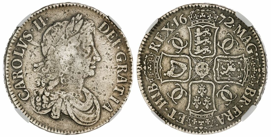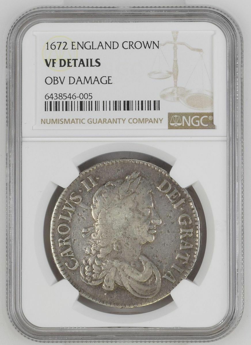 (x) NGC VF | Charles II (1660-1685), Crown, 1672 VICESIMO QVARTO, no stop after HIB, third laureate and draped bust right, rev. crowned shields cruciform, interlinked C's in angles, seven strings to harp, upwards lettered edge, 6h (ESC 45; Bull 388; Spink 3358), pock marked to the obverse and rubbed to the higher points of the central devices, bolder fine, in NGC holder, graded VF Details ~ Obverse Damage (Cert. #6438546-005)