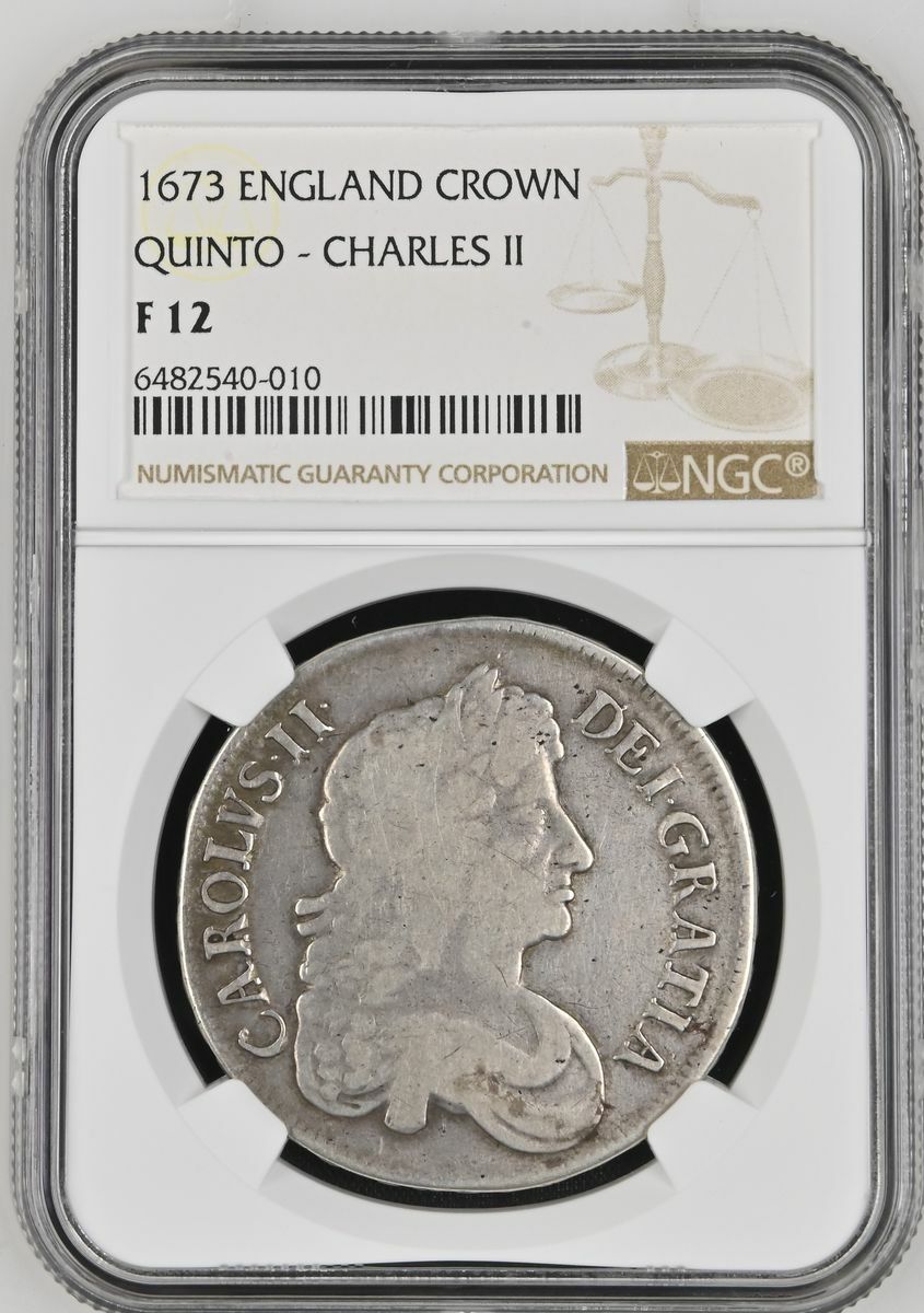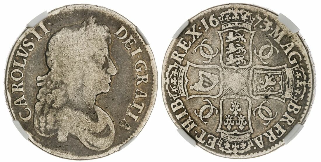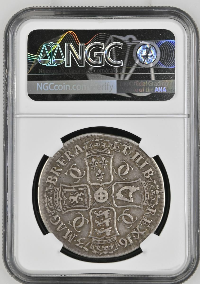(x) NGC G6 | Charles II (1660-1685), Crown, 1673 over 2 VICESIMO QVINTO, third laureate and draped bust right, rev. crowned shields cruciform, eight strings to harp, lettered edge downwards, 29.17g, 6h (Bull 393, yet eight strings not noted; ESC 48; Spink 3358), only good, but the overdate scarce, in NGC holder, graded G6 (Cert. #6482540-011)