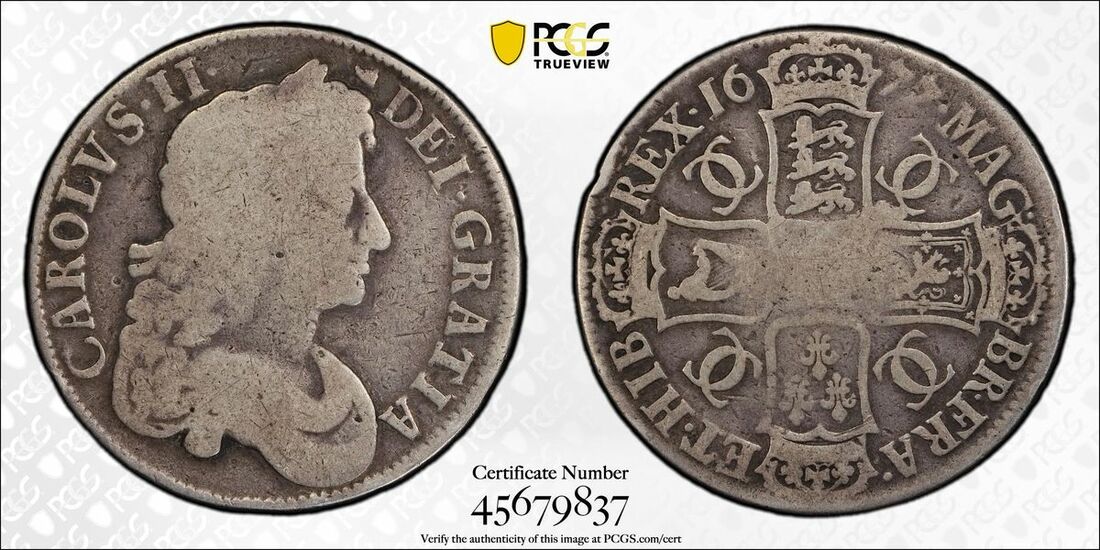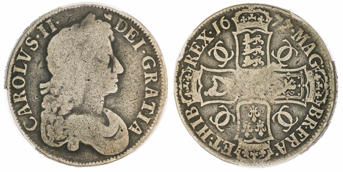 (x) PCGS VG10 | Charles II (1660-1685), 'Boar's Head Flaw' Crown, 1677 over 6 VICESIMO NONO, third laureate and draped bust right, rev. crowned shields cruciform, interlinked C's in angles, seven strings to harp, downwards lettered edge, 6h (ESC 54; Bull 399A [R]; Spink 3358), flat to the portrait and reverse centre, with 'boar's head' flaw above bust, fair to fine, in PCGS holder, graded VG10 (Cert. #45679837)