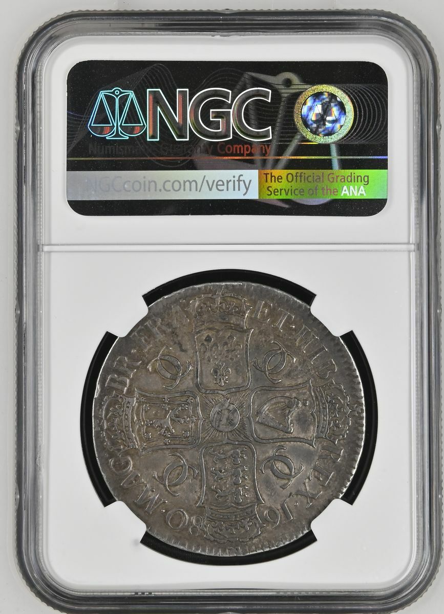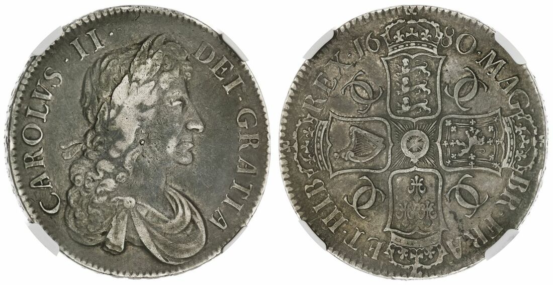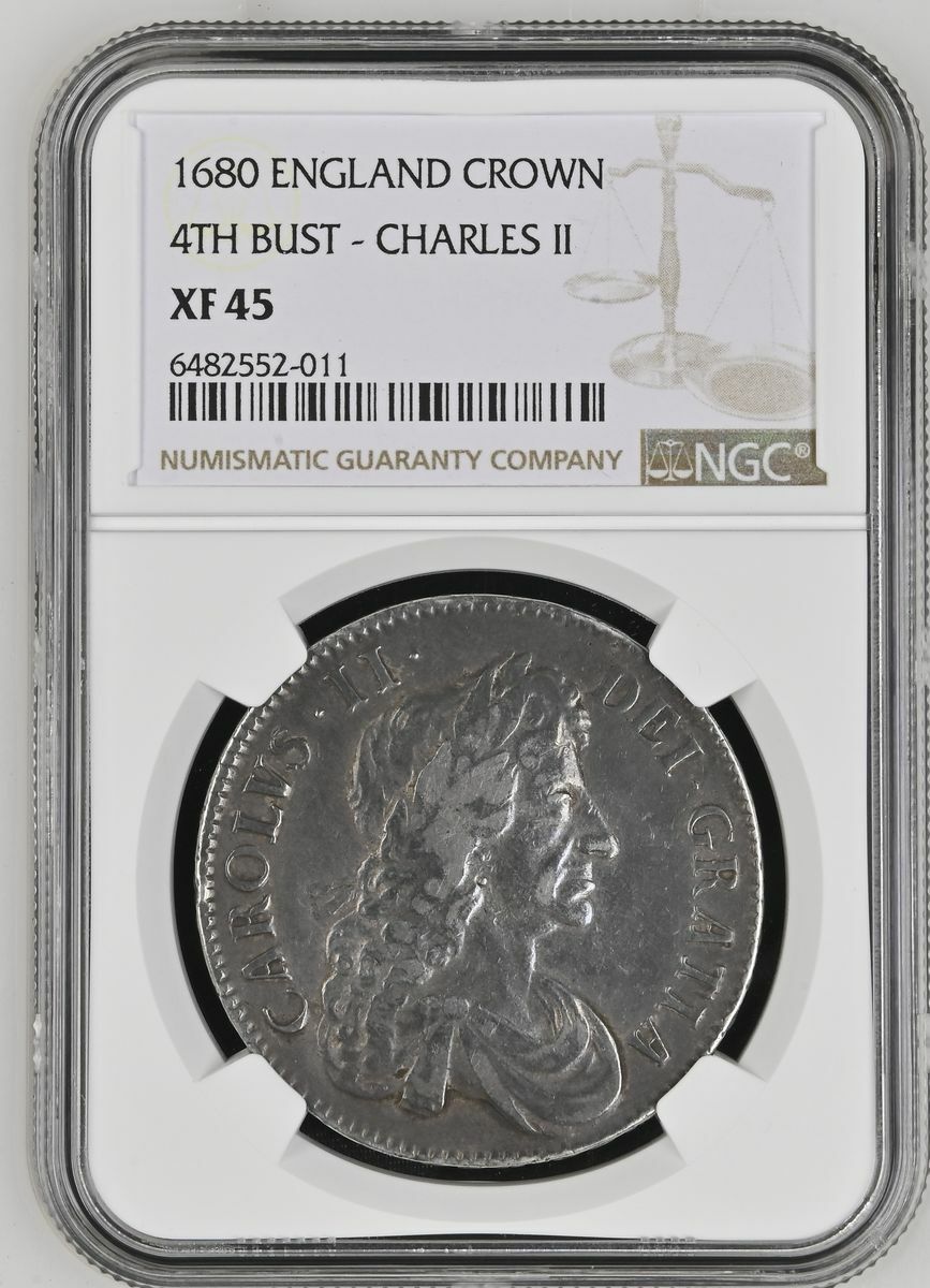 (x) NGC XF45 | Charles II (1660-1685), Crown, 1680 TRICESIMO SECVNDO, fourth laureate and draped bust right, rev. crowned shields cruciform, interlinked C's in angles, seven strings to harp, downwards lettered edge, 6h (ESC 60; Bull 412; Spink 3359), rubbed to the hair, lightly contact marked to darkened surfaces, very fine, in NGC holder, graded XF45 (Cert. #6482552-011)