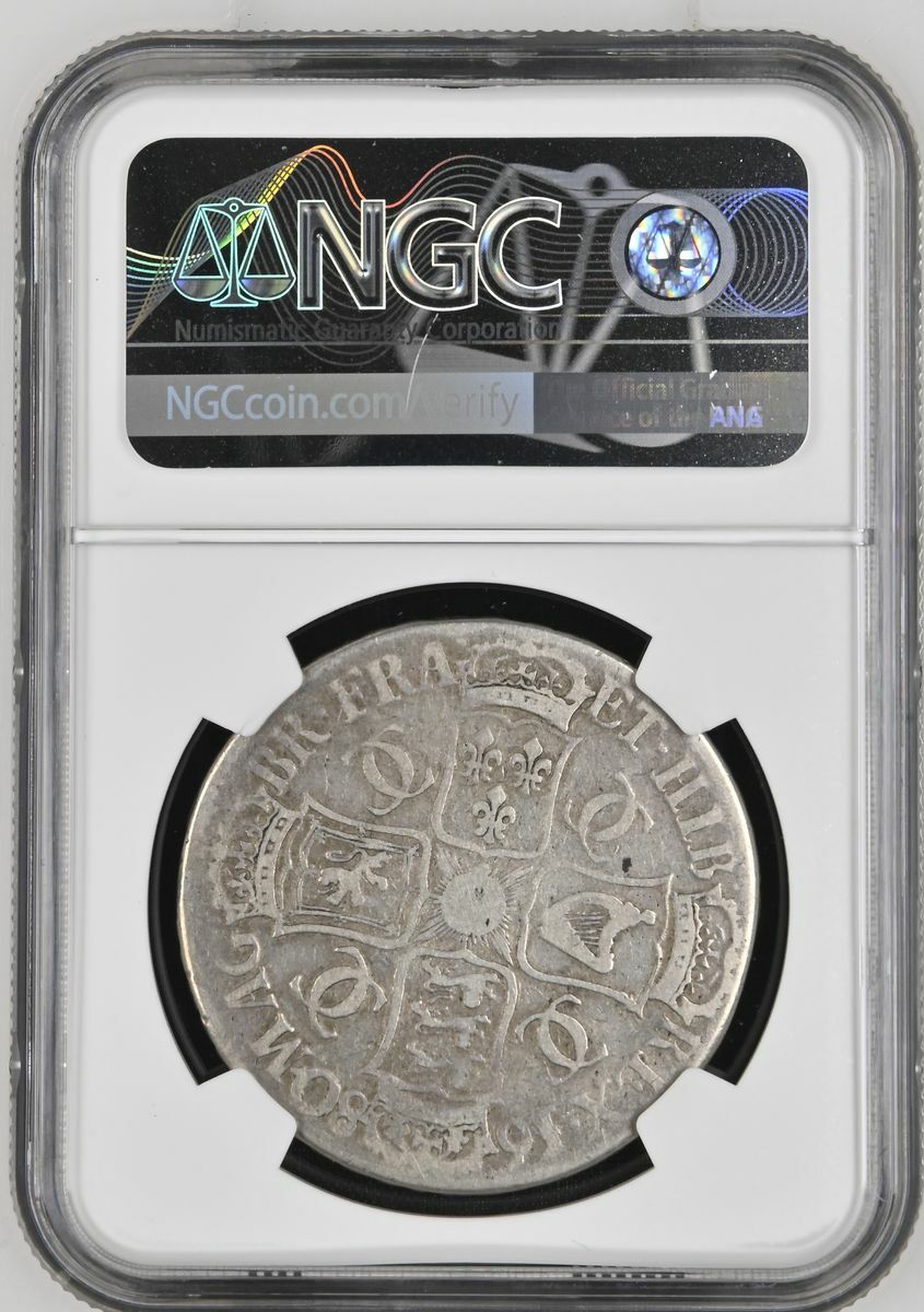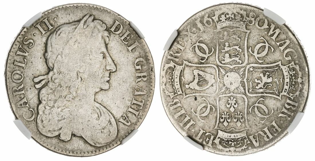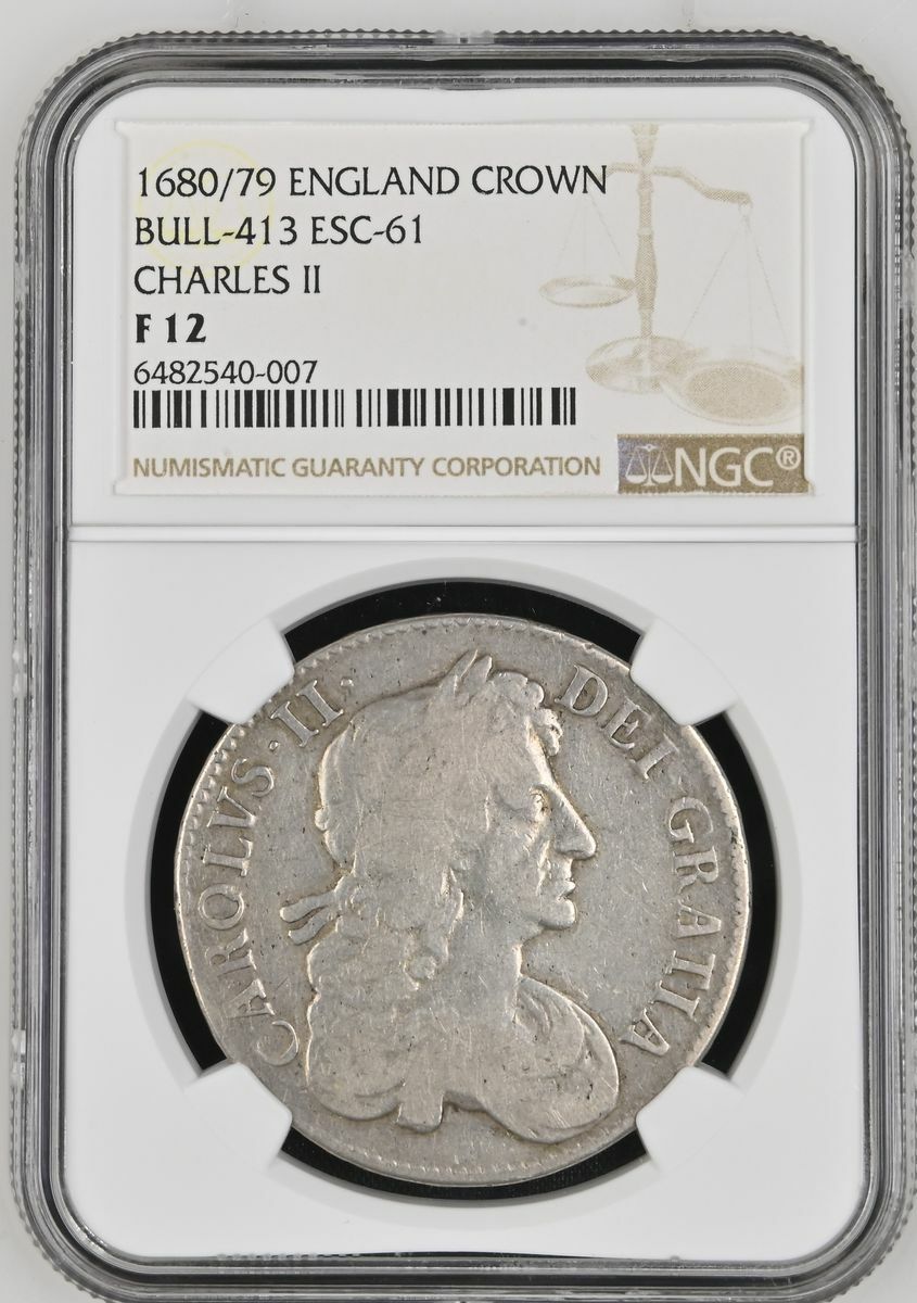 (x) NGC Fine 12 | Charles II (1660-1685), Crown, 1680 over 79, third laureate and draped bust right, rev. stop after HIB, crowned shields cruciform, eight strings to harp, lettered edge irregularly spaced upwards, 29.04g, 6h (Bull 411; ESC 59; Spink 3358), rubbed and lightly polished on obverse, the reverse toned, good / fine, the overdate clear, in NGC holder, graded F12 (Cert. #6482540-007)