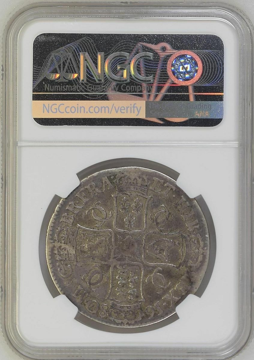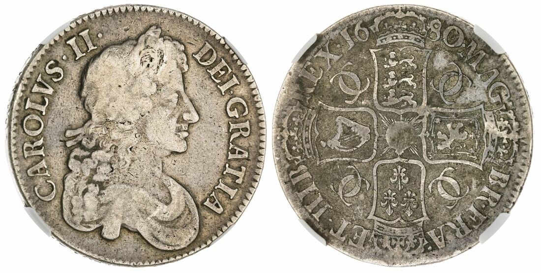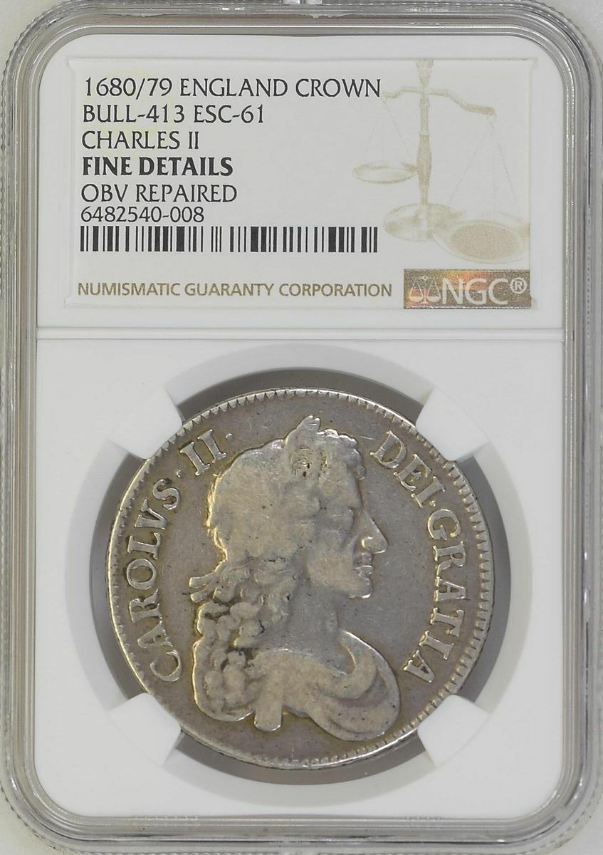 (x) NGC F | Charles II (1660-1685), Crown, 1680 over 79, fourth laureate and draped bust right, rev. crowned shields cruciform, seven strings to harp, lettered edge irregularly spaced downwards, 30.29g, 6h (Bull 413 [R2]; ESC 61; Spink 3359), rubbed, good to fair, but rare, in NGC holder, graded Fine Details ~ Obverse Repaired (Cert. #6482540-008)