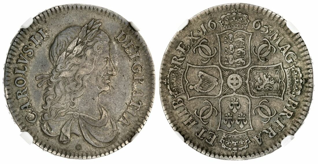 (x) NGC XF45 | Charles II (1660-1685), Halfcrown, 1663 XV, first laureate and draped bust right, rev. crowned shields cruciform, six strings to harp, lettered edge, 14.90g, 6h (Bull 438; ESC 457; Spink 3361), light even wear down the central details both sides, but problem free surfaces with light steel grey toning, an attractive very fine, in NGC holder, graded XF45 (Cert. #6482552-010)