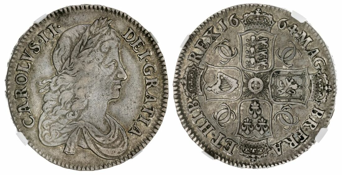 (x) Charles II (1660-1685), Halfcrown, 1664 XVI, second laureate and draped bust right, rev. crowned cruciform shields, interlinked C's in angles, six strings to harp, upwards lettered edge, 7h (ESC 460; Bull 445 [R2]; Spink 3362), lightly wiped and soft to the highest points of central devices, otherwise toned, about very fine, in NGC holder, graded XF DETAILS, CLEANED (Cert. #6482552-027)