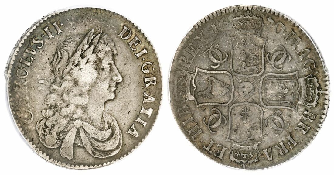(x) PCGS VF35 | Charles II (1660-1685), Halfcrown, 1670 V. SECVNDO, third laureate and draped bust right, no stops after HIB, rev. crowned cruciform shields, interlinked C's in angles, seven strings to harp, upwards lettered edge, 6h (ESC 467; Bull 453; Spink 3365), lightly haymarked and with softness to the hair and in the legends, otherwise toned and with a faint lustre to the peripheries, just very fine, in NGC holder, graded VF35 (Cert. #351032.35)