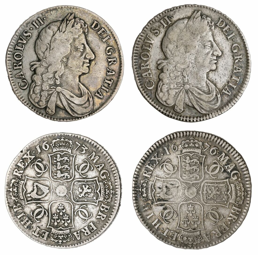 Charles II (1660-1685), Halfcrown, 1673 V. QVINTO, fourth draped and laureate bust right, rev. seven strings to harp, downwards lettered edge, 7h, 14.79g (ESC 473; Bull 463; Spink 3367), cleaned and rubbed in parts, otherwise about very fine; Halfcrown, 1676 V. OCTAVO, fourth draped and laureate bust right, rev. six strings to harp, downwards lettered edge, 7h, 14.92g (ESC 478; Bull 471; Spink 3367), lightly flecked and with some rub, yet with a light and residual tone, very fine (2)