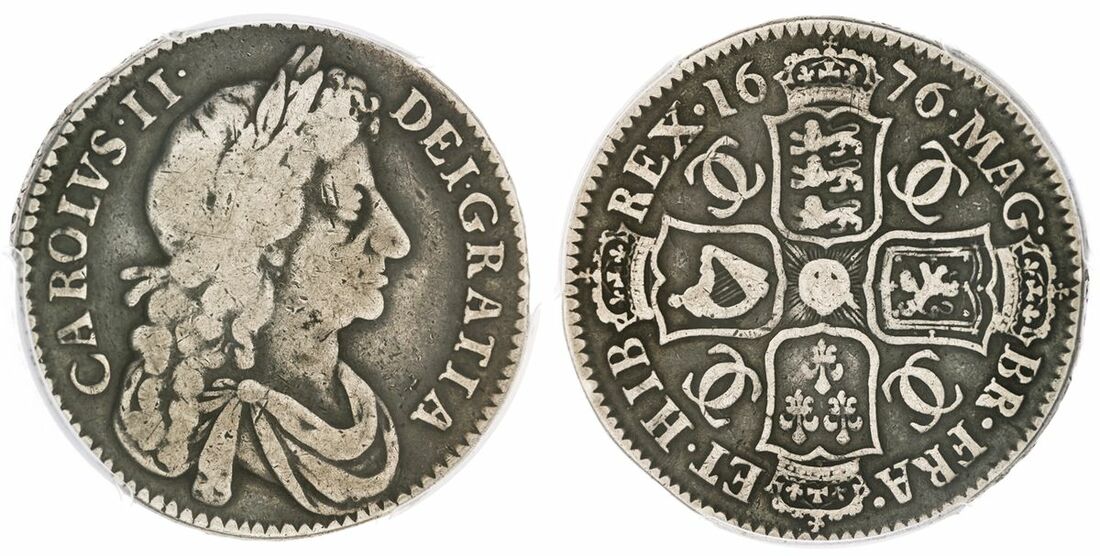 (x) PCGS F15 | Charles II (1660-1685), Halfcrown, 1676 OCTAVO, 'Retrograde 1', fourth laureate and draped bust right, rev. crowned cruciform shields, interlinked C's in angles, six strings to harp, upwards lettered edge, 6h (ESC 478; Bull 471; Spink 3367), the central devices mostly flat, darkened fields, bold fine, in PCGS holder, graded F15 (Cert. #618132.15/45679839)