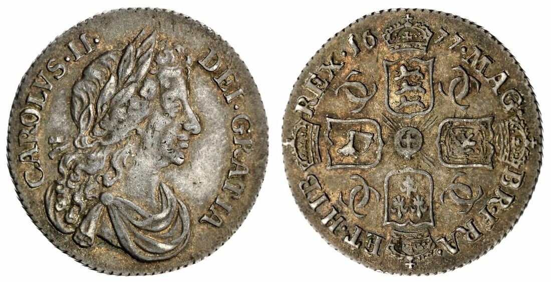 Charles II (1160-1685), Sixpence, 1677, G over O, laureate and draped bust right, rev. crowned shields cruciform, four strings to harp, edge obliquely milled, 6h, 3.01g (Pywell-Phillips 78; Viles 3782; ESC -; Bull 572 [R] Spink 3382), MAG double struck and G over O, pin marked to the face, yet with a most pleasing and full lustre to toned surfaces, nearing extremely fine