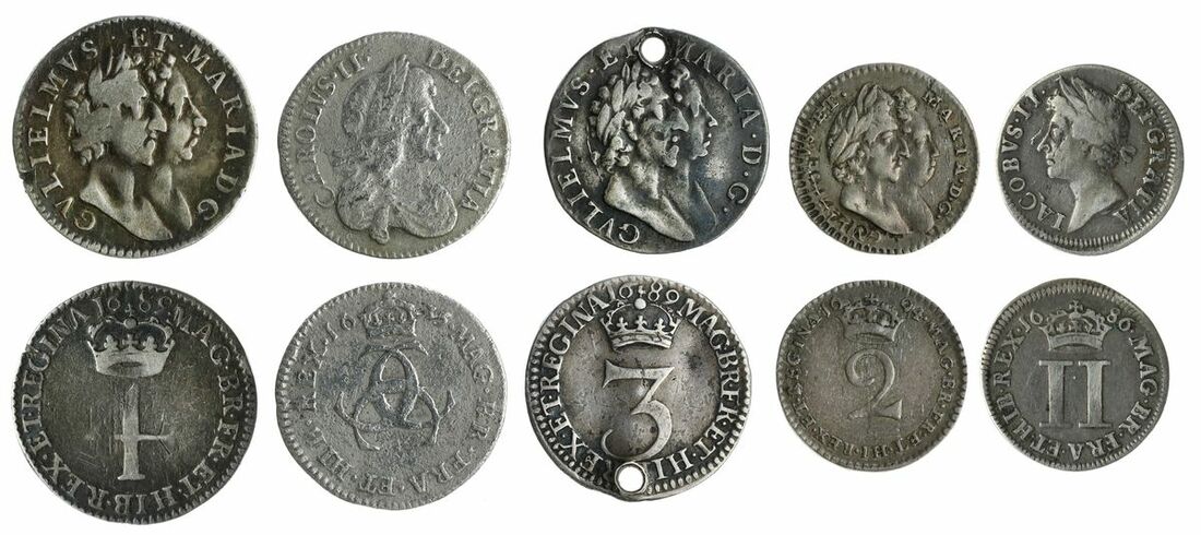 Maundy Coins (5) | Charles II (1660-1685), Threepence, 1675, 1.35g, 6h (ESC 1965; Bull 651; Spink 3386), cleaned and with pitted surfaces, fine; also, James II (1685-1688), Twopence, 1686, small O in IACOBVS, 0.92g, 6h (ESC -; Bull 804; Spink 3416), struck slightly off-centre and with some rub to the hair, otherwise with pleasing grey fields, very fine; additionally, William and Mary (1688-1694), Fourpence, 1689, 1.95g, 6h (ESC 1865; Bull 877; Spink 3439), small edge split to edge at 9 o'clock, some rub to otherwise richly toned surfaces, good fine; also, Threepence, 1689, 1.44g, 6h (ESC -; Bull 916; Spink 3441), pierced, yet about very fine; Twopence, 1694, 0.97g, 6h (ESC 2203; Bull 955; Spink 3443), toned, good very fine (5)
