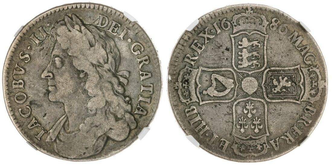 (x) NGC F15 | James II (1685-1688), Halfcrown, 1686 SECVNDO, first laureate and draped bust left, rev. crowned cruciform shields, seven strings to harp, downwards lettered edge, 6h (ESC 494; Bull 749; Spink 3408), somewhat flat and scarcely fine, rare, in NGC holder, graded F15 (Cert. #6482540-005)