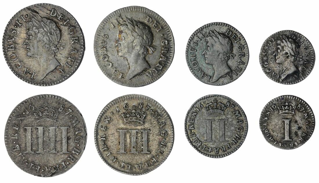 James II (1685-1688), Maundy Coins, 1687 (4), Fourpence to Penny, laureate head left, rev. crowned mark of value, edge plain (Bull 782; ESC 2382; Spink 3418) some softness to the busts, some haymarking to Fourpence and Threepence yet lustrous, otherwise all darkly toned, very fine (4)