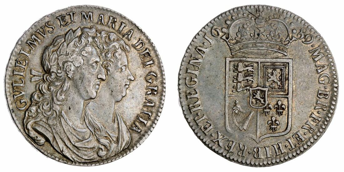 William and Mary (1688-1694), Halfcrown, 1689 PRIMO, first conjoined and draped busts right, rev. crowned first shield, seven strings to harp, upwards lettered edge, 6h, 14.98g (ESC 505; Bull 831; Spink 3434), touch of rub in parts, otherwise residually lustrous to darkened and tones surfaces, good very fine