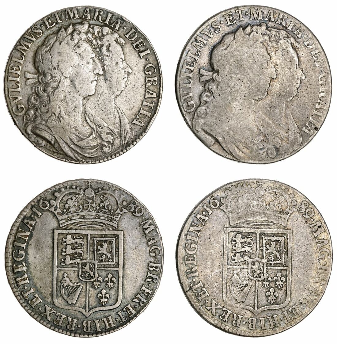 William and Mary (1689-1694), Halfcrown, 1689 PRIMO (2), first conjoined and draped busts right, rev. first crowned shield, upwards lettered edge, 6h, 14.90g (ESC 503; Bull 826; Spink 3434), bagmarked and cleaned to the obverse, yet with toning to the peripheries, bold fine / very fine; another, 6h, 14.57g (ESC 503; Bull 826; Spink 3434), flecked and flat, yet lightly toned to the fields, fine (2)