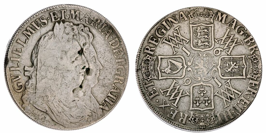 William and Mary (1689-1694), Imitation Crown Pill or Snuff Box, dated 1691, conjoined and draped busts right, rev. crowned cruciform shields, monogram in angles, 19.40g, cleaned and the obverse with some of damage, subsequently mended, otherwise in full working order, about very fine