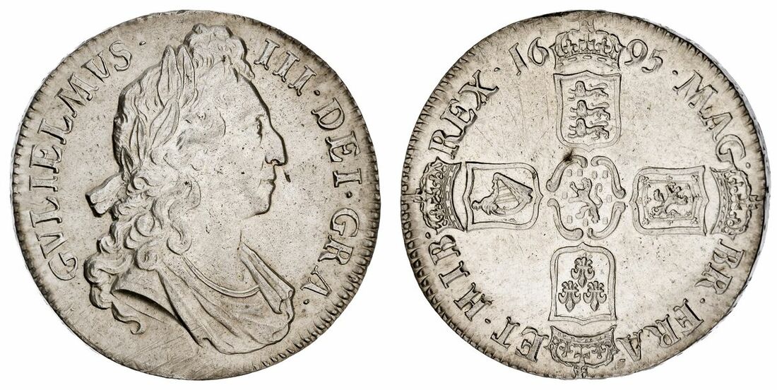 William III, Solus (1694-1702), Crown, 1695 SEPTIMO, first laureate and draped bust right, rev. crowned cruciform shields, six strings to early harp, upwards lettered edge, 6h, 29.85g (ESC 86; Bull 990; Spink 3470), cleaned and lightly contact marked, some flan adjustment marks below the bust, otherwise the devices handsomely struck, very fine, the devices extremely fine