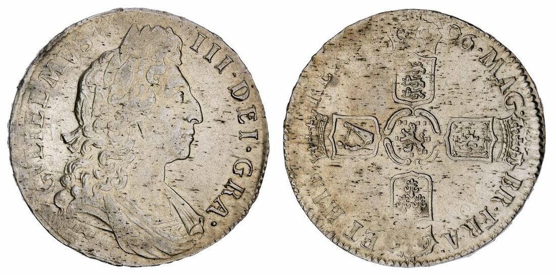 William III, Solus (1694-1702), Halfcrown, 1696 OCTAVO, laureate and cuirassed bust right, rev. crowned cruciform shields, early harp with six strings, 6h, 14.96g (ESC 534; Bull 1014; Spink 3475), some graffiti to the second reverse quarter, haymarked and the reverse struck from worn dies, otherwise lustrous, bolder very fine