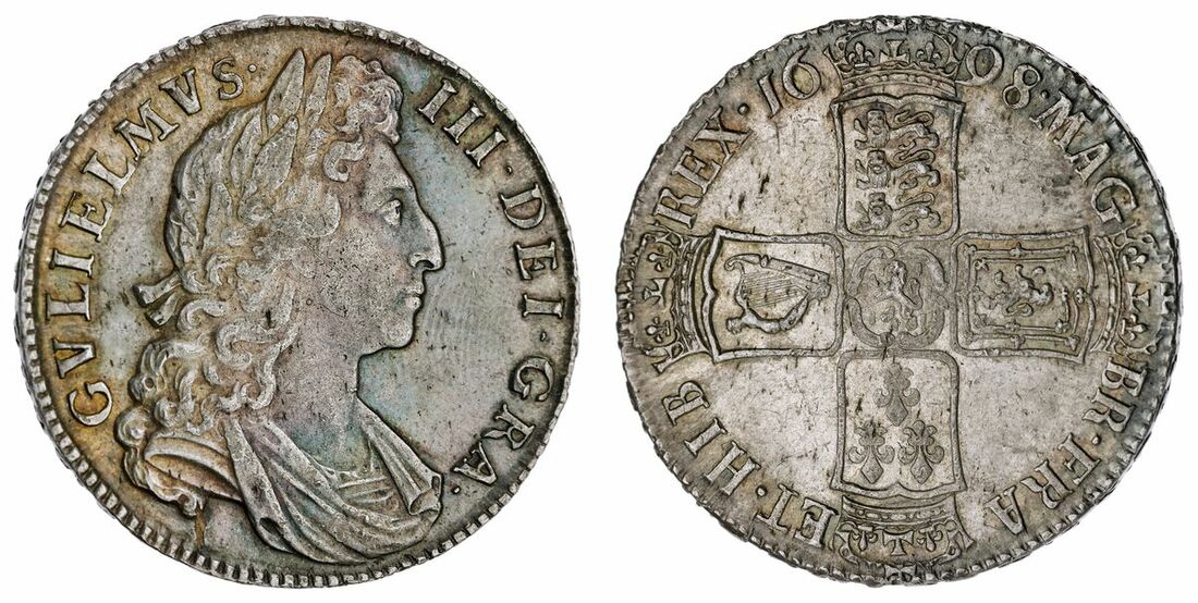 William III, Solus (1694-1702), Halfcrown, 1698 DECIMO, first laureate and draped bust right, rev. crowned large modified shields cruciform, seven strings to harp, upwards lettered edge, 6h, 15.03g (ESC 554; Bull 1034; Spink 3494), lightly contact marked to the fields and a touch of rub to the hair, otherwise with a rich tone in hues of blue and ochre, residually lustrous, extremely fine