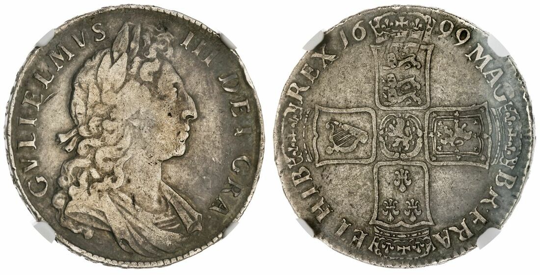 (x) NGC VF25 | William III, Solus (1694-1702), Halfcrown, 1699 UNDECIMO, first laureate, draped and cuirassed bust right, rev. crowned shields cruciform, large square shields, ordinary harp with five strings, lettered edge, 14.82g, 6h (Bull 1037; ESC 556; Spink 3494), some adjustment on shields and a scuff behind bust, otherwise somewhat flat, scarcely fine, in NGC holder, graded VF25 (Cert. #6482540-004)