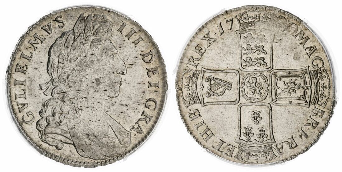 (x) William III, Solus (1694-1702), Halfcrown, 1700 DVODECIMO, laureate and draped bust right, rev. modified crowned cruciform shields, five strings to harp, downwards lettered edge, 5h (ESC 561; Bull 1043; Spink 3494), adjustment marks through the English shield, bright and haymarked, otherwise with a pleasing tone and lustre, handsome extremely fine, in PCGS holder, graded UNC DETAILS, CLEANED (Cert. #610064.92)