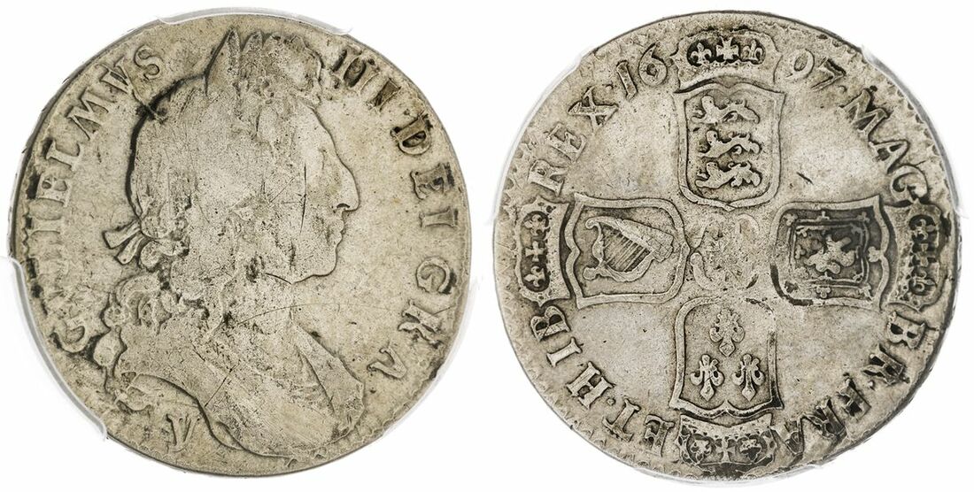(x) William III, Solus (1694-1702), 'York' Halfcrown, 1697 NONO, laureate and draped bust right, y below bust, rev. crowned cruciform shields, six strings to late harp, upwards lettered edge, 6h (ESC 551; Bull 1100; Spink 3492), heavily cleaned and tooled to flattened surfaces, fair, in PCGS holder, graded F DETAIL, CLEANED (Cert. #794834.92)