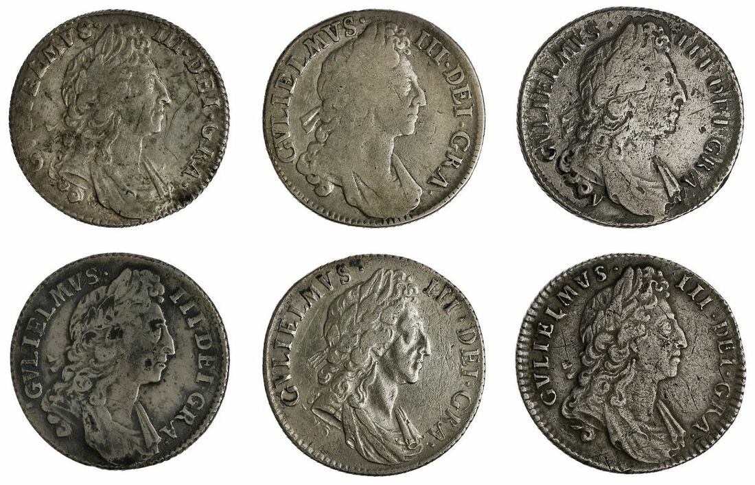 William III, Solus (1694-1702), Shilling, 1696 (2), first laureate and draped bust right, rev. crowned cruciform shields, obliquely milled edges, 6h, 5.71g; 6h, 5.41g (ESC 1078; Bull 1104; Spink 3497), the first flat and with some pitted marks, fine, the second cleaned and pitted, fair; Shilling, 1697 (2), laureate and draped bust right, rev. crowned cruciform shields, obliquely milled edge, 6h, 5.87g; 6h, 5.93g (ESC 1091; Bull 1117; Spink 3497), both with some rub, the second scratched, bold fine; Shilling, 1697, third laureate and draped bust right, rev. crowned cruciform shields, obliquely milled edge, 6h, 5.71g (ESC 1102; Bull 1128; Spink 3505), heavily cleaned, fine; Shilling, 1698, third laureate and draped bust variety right, rev. crowned cruciform shields, obliquely milled edge, 6h, 5.90g (ESC 1112; Bull 1136; Spink 3511), wiped and flat, yet some tone to the reverse, fair (6)