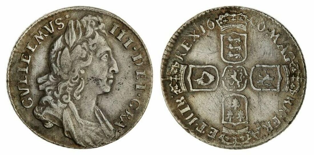 William III, Solus (1694-1702), Sixpence, 1696, second V inverted A in GVLIELMVS, first laureate and draped bust right, rev. large crowned shields cruciform, early harp with three strings, obliquely milled edge, 2.94g, 6h (ESC -; cf. Bull 1203; Spink 3520), lightly porous surfaces and scratched, yet with some toning to legends, a bolder fine, the supposed variety putative in this instance; additionally, Anne (1702-1714), 'Post-Union' Sixpence, 1711, draped bust left, rev. crowned cruciform wide shields, plain in angles, five strings to harp, obliquely milled edge, 2.83g, 6h (ESC 1596A; Bull 1461; Spink 3619), bent into a love token and scratched, with some corrosion in reverse legend, fair to fine (2)