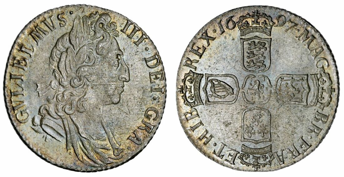 William III, Solus (1694-1702), Sixpence, 1697, third laureate and cuirassed bust right, rev. crowned cruciform shields, four strings to late harp, obliquely milled edge, 6h, 2.84g (ESC 1566; Bull 1233; Spink 3538), with a full lustre and rich cabinet tone, a most handsome example, uncirculated