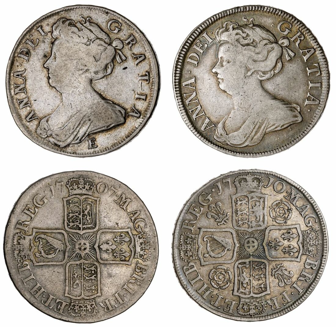 Anne (1702-1714), Post-Union, 'Roses and Plumes' Halfcrown, 1710 NONO, second draped bust left, rev. crowned cruciform shields, roses and plumes in angles, seven strings to harp, downwards lettered edge, 6h, 14.77g (ESC 581; Bull 1372; Spink 3607), wiped and lightly contact marked, otherwise with a pleasing tone to the peripheries, about very fine; 'Edinburgh' Halfcrown, 1707 SEXTO, first draped bust left, rev. crowned cruciform shields, seven strings to harp, downwards lettered edge, 5h, 14.66g (ESC 575; Bull 1379; Spink 3605), flat in parts in parts and lightly contact marked, yet toned, bolder fine (2)
