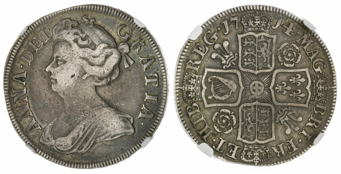 (x) NGC VF30 | Anne (1702-1714), Post-Union, 'Rose and Plumes' Halfcrown, 1714 D. TERTIO, second draped bust left, rev. crowned cruciform shields, roses and plumes in angles, seven strings to harp, downwards lettered edge, 6h (ESC 585; Bull 1377; Spink 3607), some flecking to rubbed surfaces, nevertheless with a dark tone to uniformly grey fields, near very fine, in NGC holder graded VF30 (Cert. #5878356-027)