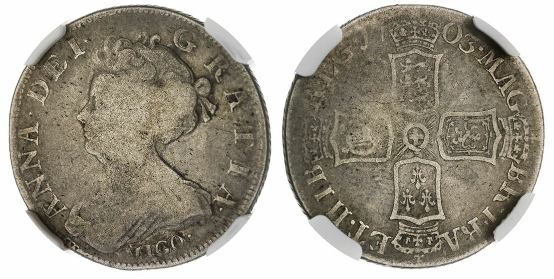 (x) NGC G6 | Anne (1702-1714), Pre-Union, VIGO Shilling, 1703, second draped bust left, VIGO below, rev. crowned cruciform shields, five strings to harp [?], obliquely milled edge, 7h (ESC 1131; Bull 1388; Spink 3586), largely rubbed and flat, yet toned, fair, in NGC holder, graded G6 (Cert. #5974863-006)