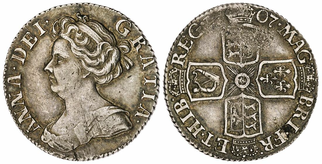 Anne (1702-1714), Post-Union, Sixpence, 1707, first draped bust left, rev. crowned cruciform shields, plain in angles, six strings to harp, obliquely milled edge, 6h, 3.03g (ESC 1587; Bull 1453; Spink 3619), some flan adjustment marks to the bust and softness to the reverse in corresponding area, otherwise lustrous and toned, handsome very fine
