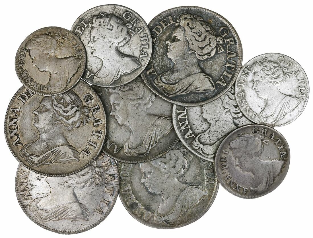 Anne (1702-1714), Pre-Union, Shilling, 1707 (2), third draped bust left, rev. plain in angles, obliquely milled edges, eight strings to harp, 6h, 6.01g; eight strings to harp, 6h, 5.95g (ESC 1141; Bull 1395; Spink 3610), both haymarked, the second wiped to the obverse, yet otherwise both with a pleasing flair and toned, bold very fine; Post-Union, Shilling, 1708, third draped bust left, rev. plain in angles, obliquely milled edge, six strings to harp, 6h, 5.95g (ESC 1147; Bull 1399; Spink 3610), wiped and lightly rubbed, yet with a light tone, near very fine; Post-Union, Shilling, 1711 (3), fourth draped bust left, rev. plain in angles, obliquely milled edges, six strings to harp, 6h, 5.79g; six strings to harp, 6h, 5.89g; six strings to harp, 6h, 5.92g (ESC 1158; Bull 1408; Spink 3618), all very lightly flecked, some wiped, although toned, fine to very fine; Post-Union, Sixpence, 1711, obliquely milled edge, 6h, 2.92g (ESC 1596; Bull 1460; Spink 3619), scratched and wiped, bolder fine; 'Pre-Union' Fourpence, 1710 (2), plain edges, 6h, 1.96g; 6h, 2.02g (ESC 1892A; Bull 1488; Spink 3595C), one cleaned, yet very fine, the other rubbed, fine; Post-Union, Threepence, 1709, no stop after date, plain edge, 6h, 1.46g (ESC 2012; Bull 1503; Spink 3596B), rubbed, yet toned, dine (10)