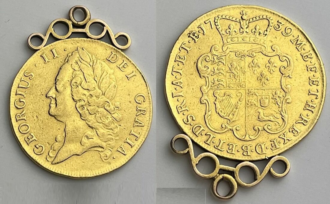 George II (1727-1760), Mounted Two-Guineas, 1739, laureate "intermediate" head left, rev. crowned garnished shield, seven string to harp, edge chevron milled, 17.49g, 5h (MCE 293; EGC 574; Spink 3668), with integral 19th Century soldered rose gold (XRF tests at least 37.5%) mount for suspension, the surfaces otherwise sweated, the rims smoothed, struck details bolder than fine