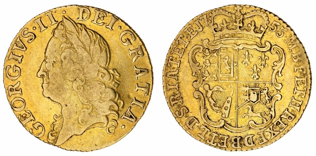 George II (1727-1760), Half-Guinea, 1755, old laureate bust left, rev. crowned and garnished shield, seven strings to harp, obliquely milled edge, 6h, 4.12g (MCE 363; Bull 657; Spink 3685), wiped and soft to the portrait, otherwise with a light tone in the fields, very fine