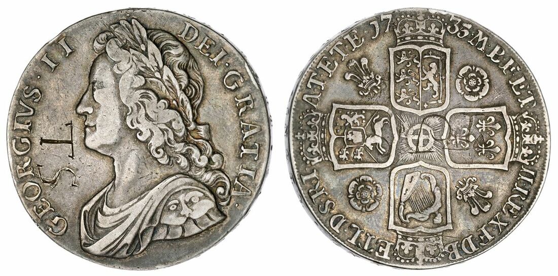 George II (1727-1760), 'Roses and Plumes' Crown, 1735 OCTAVO, young laureate, draped and cuirassed bust left, rev. crowned shields cruciform, roses and plumes in angles, twelve strings to harp, edge lettered upwards, 29.67g, 7h (ESC 120; Bull 1663; Spink 3686), old graffiti in obverse field and across reverse central devices, otherwise rubbed and toned, struck details almost very fine