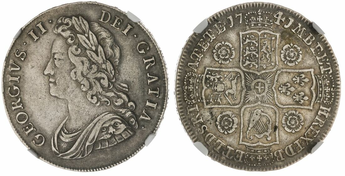 (x) NGC VF35 | George II (1727-1760), 'Roses' Halfcrown, 1741 over 39 D. QVARTO, young laureate, draped and cuirassed bust left, rev. crowned cruciform shields, roses in angles, seven strings to harp, edge lettered upwards, 6h (Bull 1682; ESC 601A; Pywell-Phillips - [cf. 322]; Spink 3692), lightly contact marked and stained to the reverse, otherwise toned, pleasing very fine, in NGC holder, graded VF35 (Cert. #6438546-006)