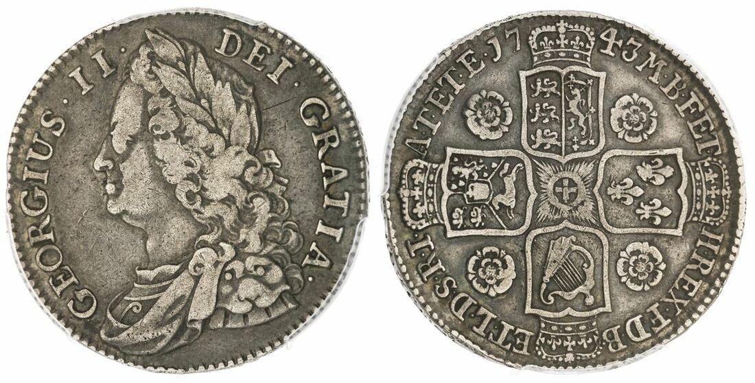 (x) PCGS VF35 | George II (1727-1760), 'Roses' Halfcrown, 1743 D. SEPTIMO, old laureate, draped and cuirassed bust left, rev. crowned cruciform shields, eight strings to harp, downwards lettered edge, 6h (ESC 603A; Bull 1684; Spink 3694), scratch behind the bust and rubbed to the portrait, otherwise with a dark grey tone, near very fine / very fine, in PCGS holder, graded VF35 (Cert. #140005.35)