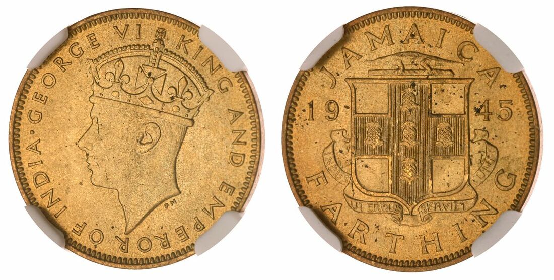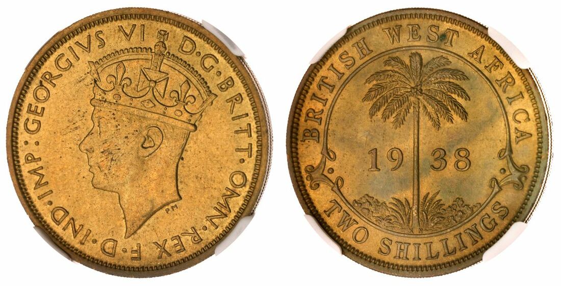 (x) NGC MS64 | British West Africa, George VI (1936-1952), Two Shillings, 1938 KN, crowned bust left, rev. palm tree dividing date, milled edge, 12h (KM 24), some very faint contact marks, otherwise with a full and pleasing cartwheel lustre, uncirculated, in NGC holder, graded MS64 (Cert. #6493545-004); NGC MS65 | Jamaica, George VI (1936-1952), Farthing, 1945, crowned bust left, rev. arms, plain edge, 12h (KM 30), some spots of carbon, otherwise with a full and pleasing cartwheel lustre, uncirculated, in NGC holder, graded MS65 (Cert. #6493545-011); NGC MS64 RB | German East Africa, Wilhelm II, Half Heller, 1904 A, plain edge, 11h (KM 6), with largely mint red surfaces, uncirculated, in NGC holder, graded MS64 RB (Cert. #6376454-022) (3)